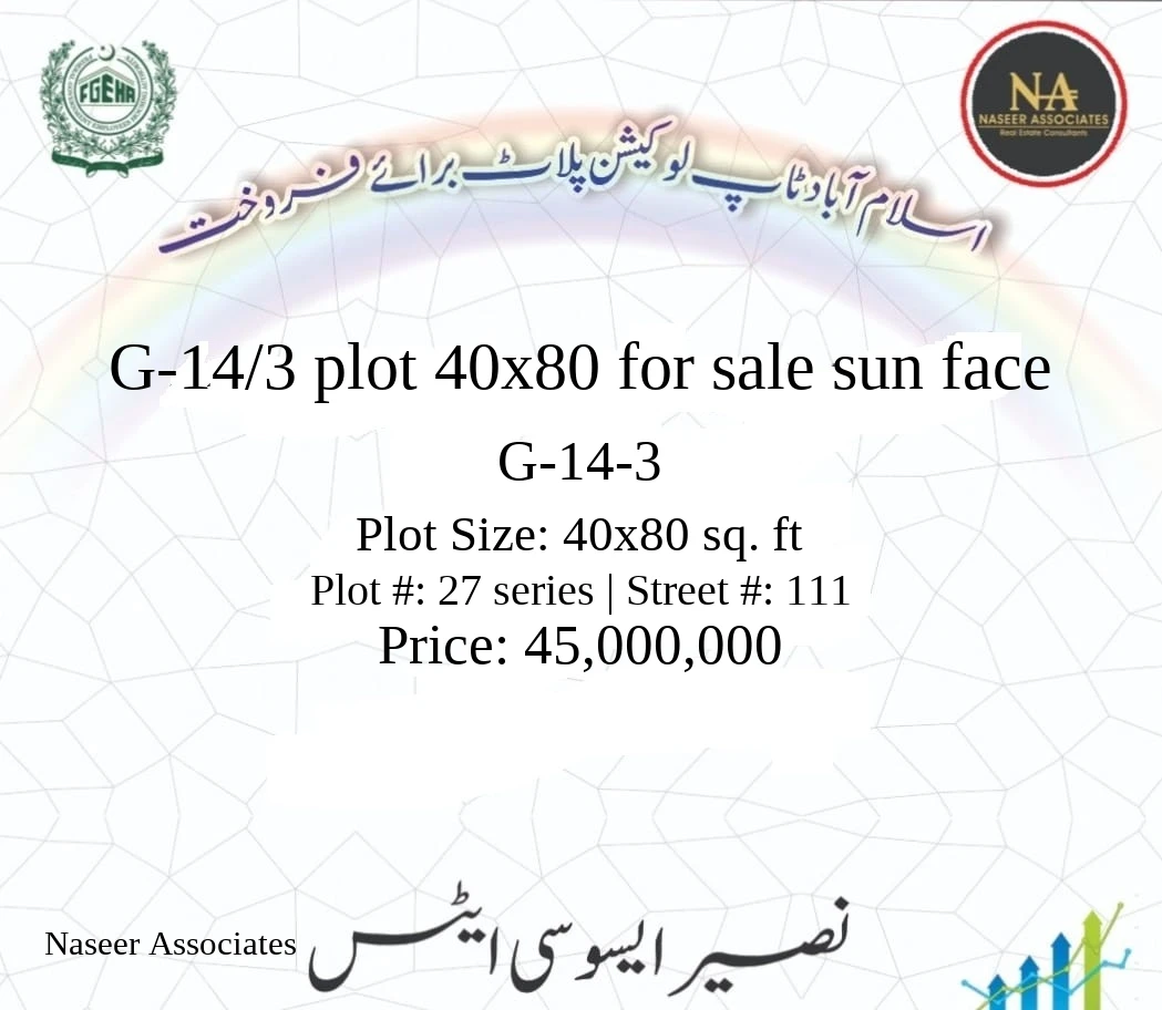 Donβt miss out on this prime sun-facing plot in G-14-3. Contact us today to schedule a site visit or to discuss the final offer details. Secure your future in one of Islamabadβs most promising residential sectors now!
